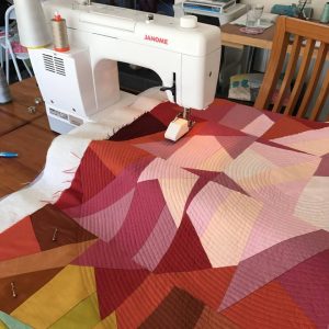 Description: “The inspiration for this Quilt comes from having read Amy Friend’s book “Improv Paper Piecing”, which led me to design the block that can be observed and that is repeated throughout this Quilt. I used a palette of colors of my taste, using more than 40 different colors, with which I made a transition from the center to the outside. To Quilt it, I decided to use a spiral, since it enhances the focal point of the Quilt and gives it a greater depth”.