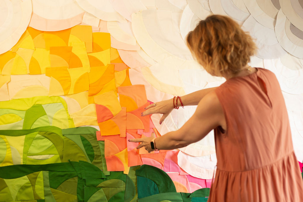 The finished quilt is not a copy of the original idea. It is the result of a conversation — between thought and hand, wall and table, structure and intuition.