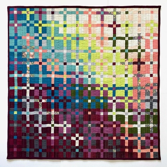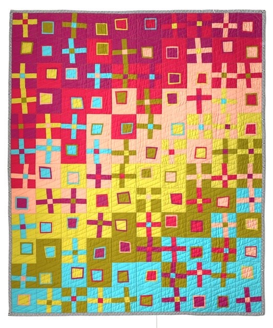 Color value and graphic elements are a go-to recipe for my original work. Here, in ‘Bright Blooms on a Lattice’ I marry bold and bright bursts of color against a rigid grid to suggest blooms and vines dancing about a lattice. I constructed the entire quilt using a single 3-color cross block, but play with color value combinations and their positions to make the cross grid protrude or recede in different locations so as to undulate across this quilt.
