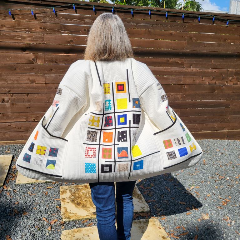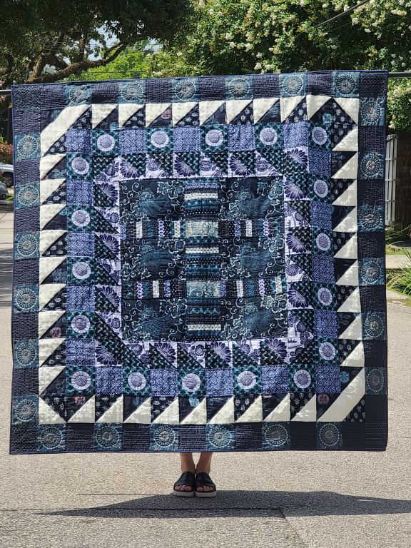 My first love is writing and for the past 9 years I’ve been able to marry that love to my other love, quilting. I am the author of 5 nonfiction books on quilt history, textiles, cotton, indigo, and social justice art. I also write for Quiltfolk and Curated Quilts. In between writing assignments, I quilt, sew, and walk the dog. I make all kinds of quilts and I don’t limit myself to any one style or technique. My quilts are made for the couch, the walls, for gifts, for art, and mostly for my closet shelves. I love the modern aesthetic, but I also sometimes fall back on traditional styles with modern colors. I have a super awesome studio space with several machines and a longarm. But I also do a fair amount of hand embroidery and hand applique. I also sew clothes and leather handbags and totes. Those who know me know I am well versed in Japanese quilts and quilt history, (two of my books are about Japan), so of course I make a lot of my quilts with Japanese fabric. I have a large collection of antique, vintage, and even contemporary Japanese fabric. I also collect antique quilts, which are rapidly filling up what little storage space is left in my house.
