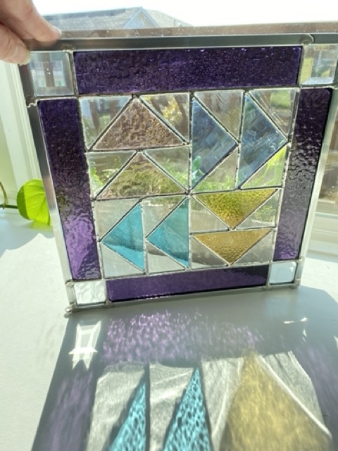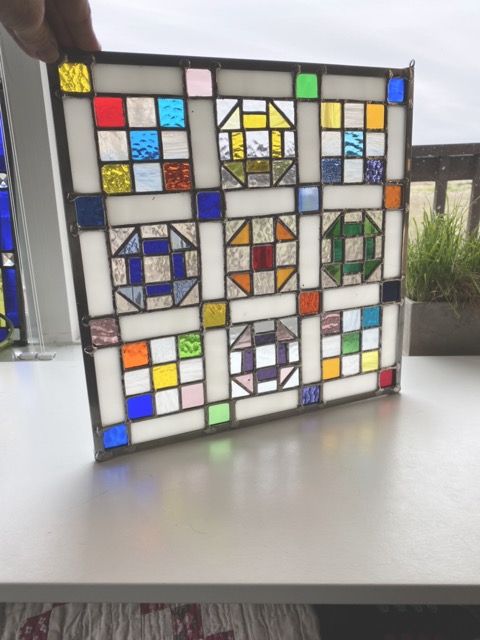 As I shared my story and photos of the completed works on social media, requests began flooding in for custom orders of glass from fellow quilting fans for their own windows. And so it began. I quickly came up with a business name, Little Glass Quilts. Designed a logo based off one of my mothers’ favorite blocks, the Monkey Wrench. Then, it was off to the courthouse to register my DBA, and I immediately began taking orders for custom Little Glass Quilts. With every LGQ I create, I like to think that my mother’s love for everything beautiful and quilting related caries on as an homage to her. While I may have only been working in this medium of glass and lead for just under a year, I have found that my love of all things quilting have effortlessly translated into every block I do!