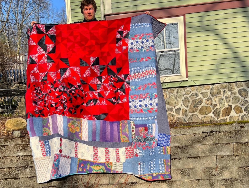 Every quilt I make uses worn fabrics because they bring an emotion and feeling to a quilt that new fabrics just can’t achieve. When I start quilting, I have only a rough plan of what the finished product will be. Often plans change. While quilting, I like to make decisions on shape, color, design quickly. I actively seek to not overthink; Quilting is fun! Everything I know about making a quilt, I learned through trial and error. I try to push myself to try new things and see what happens. I’ve picked up some less intuitive but requires technical skills through books and youtube but otherwise, I’ve learned by doing.