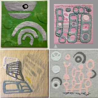 I am drawn to abstract patterns and graphic symbols or image words. I find that most of the time inspiration starts with the materials first: color, shape and pattern. I make drawings in a sketchbook for research and then improvise in the process of making. Other peoples scraps or second-hand fabrics is also part of my process.
