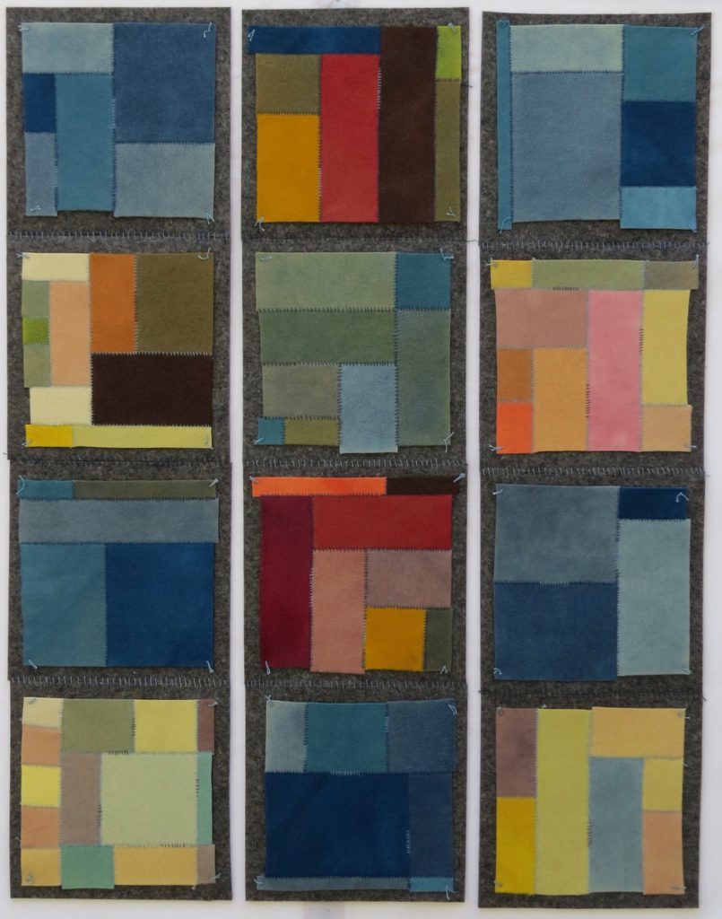 The textile art I make doesn’t start with a design, but starts with a few pieces of fabric that catch my eye because I like the colours and textures together. Then I add other pieces of fabric, and step by step, I construct a piece of shapes and layers until I think I have something interesting to look at. This process can take quite some time and involves a lot of looking, searching and going through my fabrics. The images that appear have a strong link to daily life, with objects that I like and sometimes architectural elements. In my abstract pieces I explore how colour, shapes and lines speak to one and other.