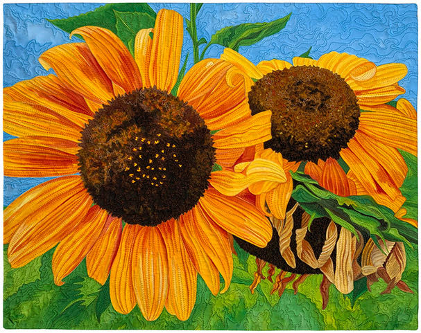 My work often starts with photos I take on my morning walks (and share on Instagram under #BeautyOnMyMorningWalk). I create fiber art based on these photos, or from my ink drawings based on them, using two primary techniques – wholecloth painting, and fused appliqué – and often heavily free-motion thread sketch the surface before quilting. A recent exhibition featured work based on plants native to North Carolina, where I live. Environmental, social justice and political concerns also are a focus.