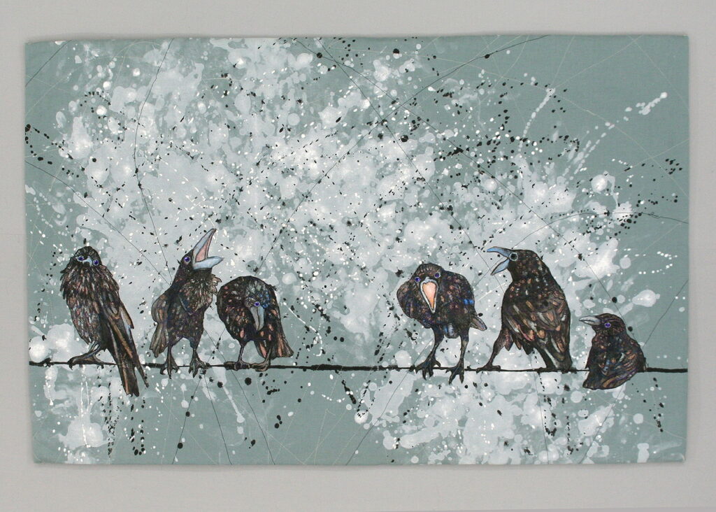 To me nature and particularly animals are perpetually inspiring and I like to explore the point of view and emotional subtext that imagery can support. My color palette is driven predominantly by creation of mood and the colors of the animals I am painting. My goal is not for highly detailed realism because my priority is focused on emotional connection to the viewer. I love to work with splashes and splatters of color because of the energy they bring to the imagery. When I add quilting I strive for the stitching to build on the emotion of the imagery.