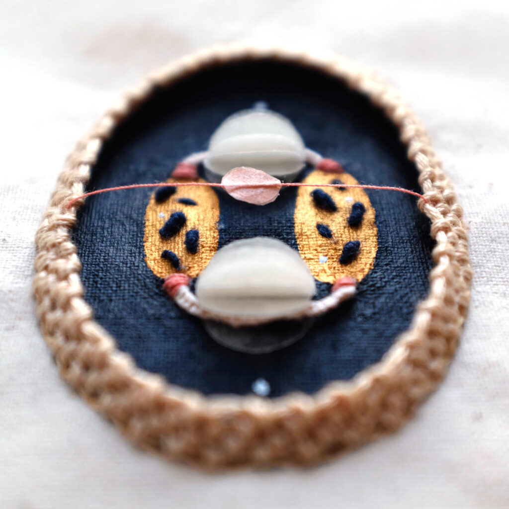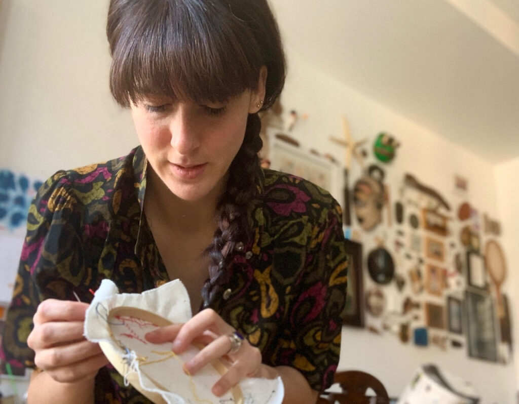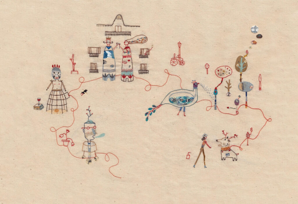 We came to create a veritable army of embroidered Smurfs, which stared at us for years, as my proud mother framed and hung all the small canvases on the walls. After that feat, I left needle and thread aside for a long time. When I started doing illustration I tried a lot of techniques to find my way. It came naturally to me to choose to use threads instead of a piece of paper because I believe that the memory of my mother’s hands, of the peace that shone through and of the magic that had so fascinated me as a child, suddenly made me feel at home after so much research. A familiar and welcoming house where, however, I had never entered before. In fact, embroidery was not a technique that I knew well, on the contrary, I had to learn most of the stitches and tricks by myself, but the feeling I felt pushed me to continue on that path. It was like one of those encounters between strangers who seem to always know each other.