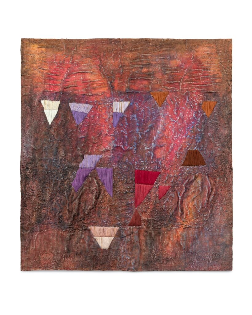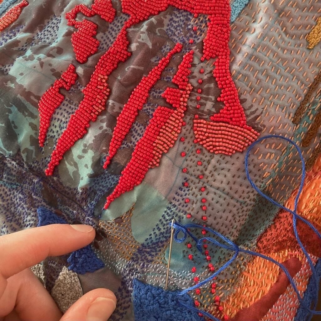 I am curious about the point where the physicality of my chosen materials (paint, thread, beads and fabric) gives way to a larger intangible experience. I work intuitively, but also slowly. Each piece takes weeks, sometimes years to unfold. Stitch by stitch, bead by bead, my art is full of labor, care and attention. I patiently work my surfaces until the dream-like worlds seem to breathe on their own, pulsating with color and light.