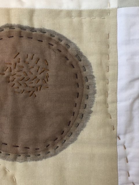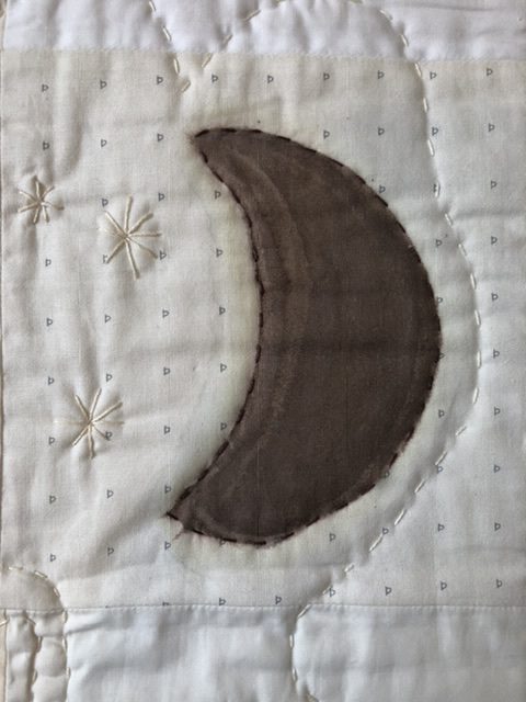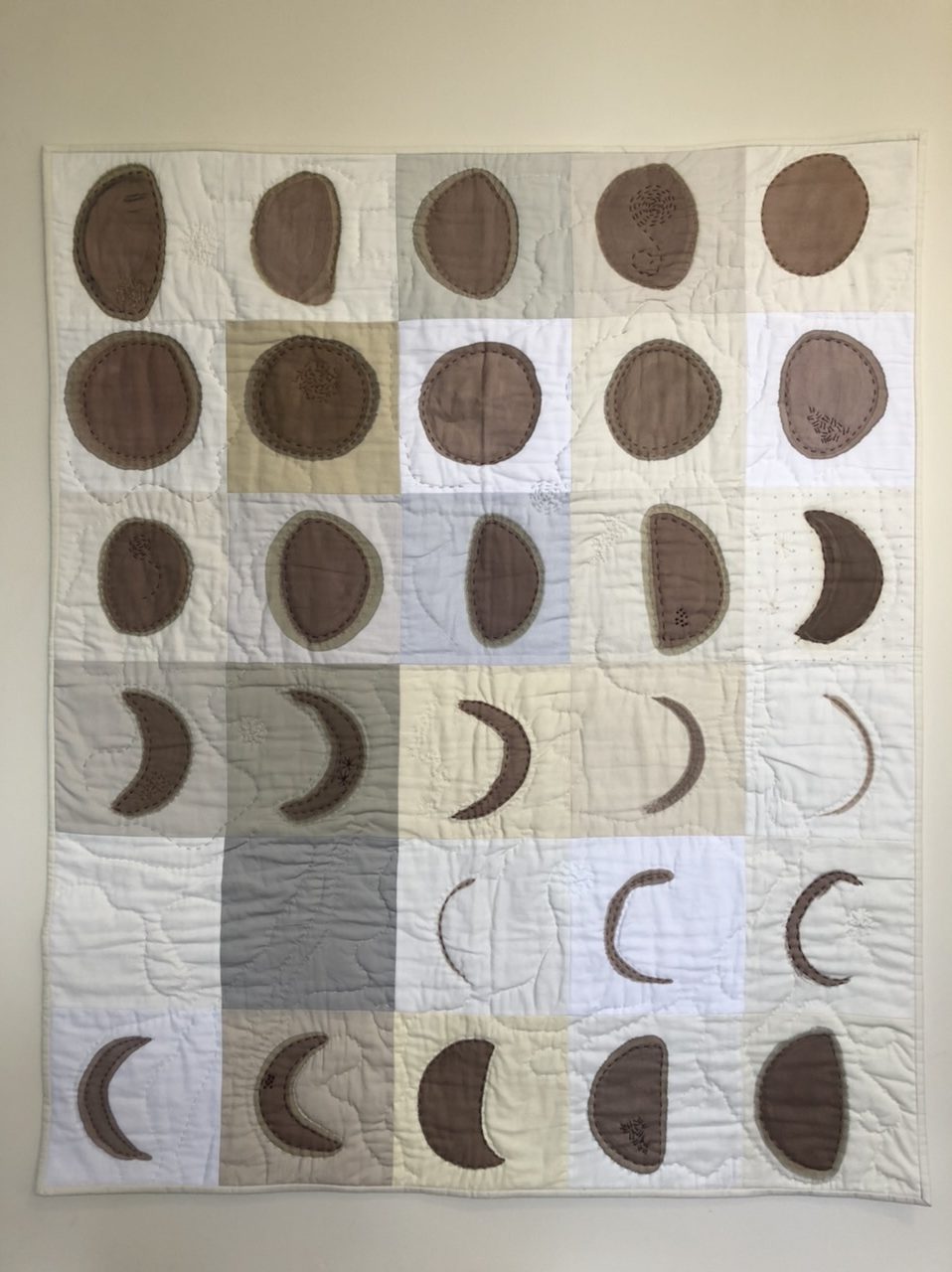 I named this quilt “November 76” because is the Lunar calendar of my birth month. I painted every moon in each of the blocks. It’s hand-quilted. I think is the only “neutral” quilts that I have made and the only one that I did for myself .