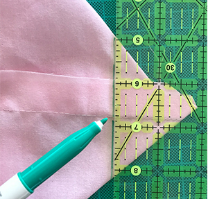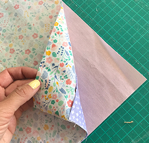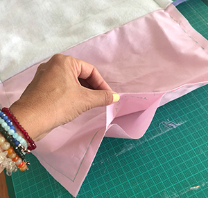 Once we finish that, we will create the flat bottom for our pouch. We will draw lines at the 4 corners (2 in the lining and 2 in the exterior of the pouch). We will draw the lines with a pencil at 1 ½” from the corner, and we will then sew on each line.