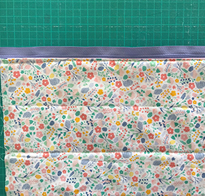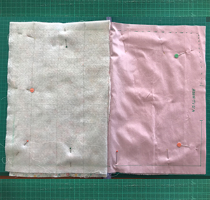 Once joined only on the external part of the pouch, both the part with and without the pocket, we will add the batting and we will quilt a couple of straight lines, to secure the batting. Be careful not to go over the pocket.