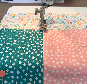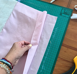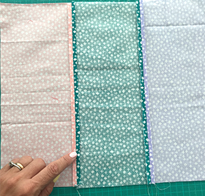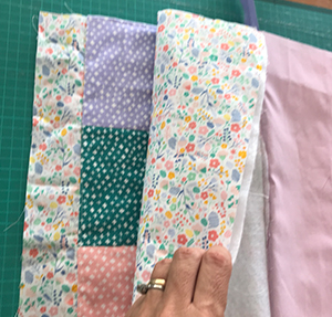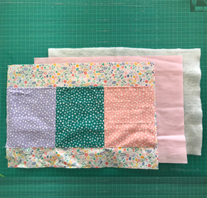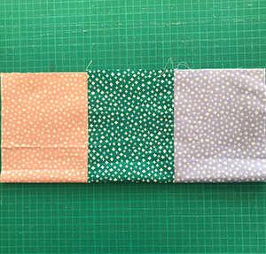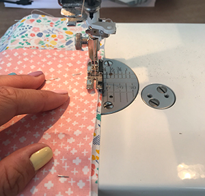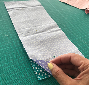 Once you have sewn the three rectangles, press the seams open. Then fold in half and put right sides together. Sew a seam with the ¼” foot to then turn right sides out, you will have something that looks like a “tube”.