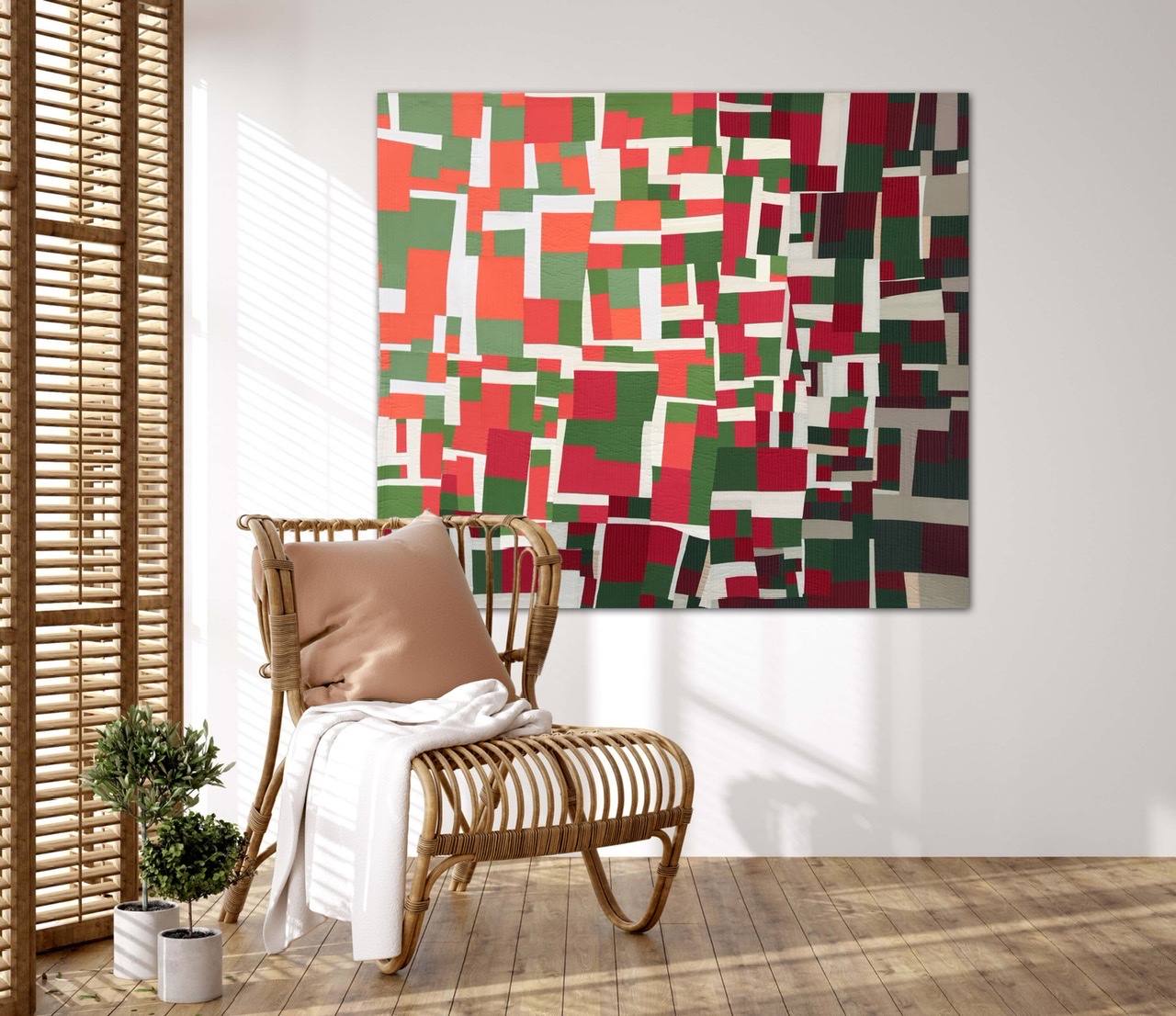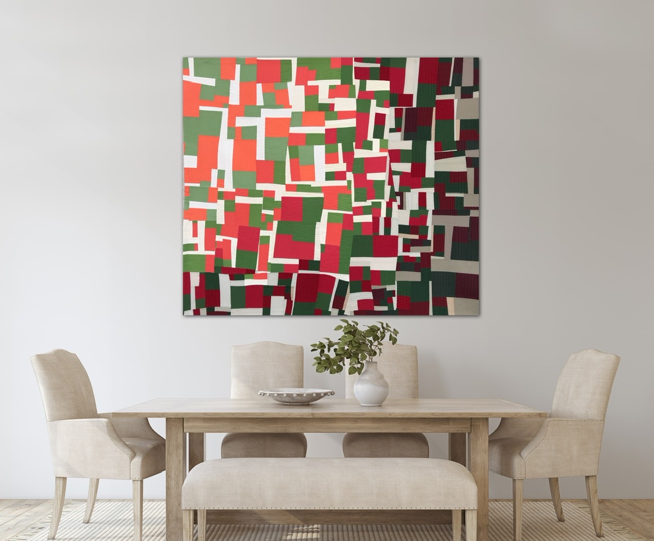 The existence of this quilt is a consequence of having read Sherri Lynn Wood’s book “The Improv Handbook for Modern Quilters.” Using one of their improvisation processes, I started cutting and joining the fabrics, where I decided to use 3 hues (green, red and white) and more than 7 values per hue . Once all the piecing and layout was done, I felt that when looking at the quilt, the effect of light and shadow was like an artificial light was illuminating the upper left corner … hence its name comes. Making this quilt was a wonderful exercise in improvisation, interaction of the color, lights and shadows”.