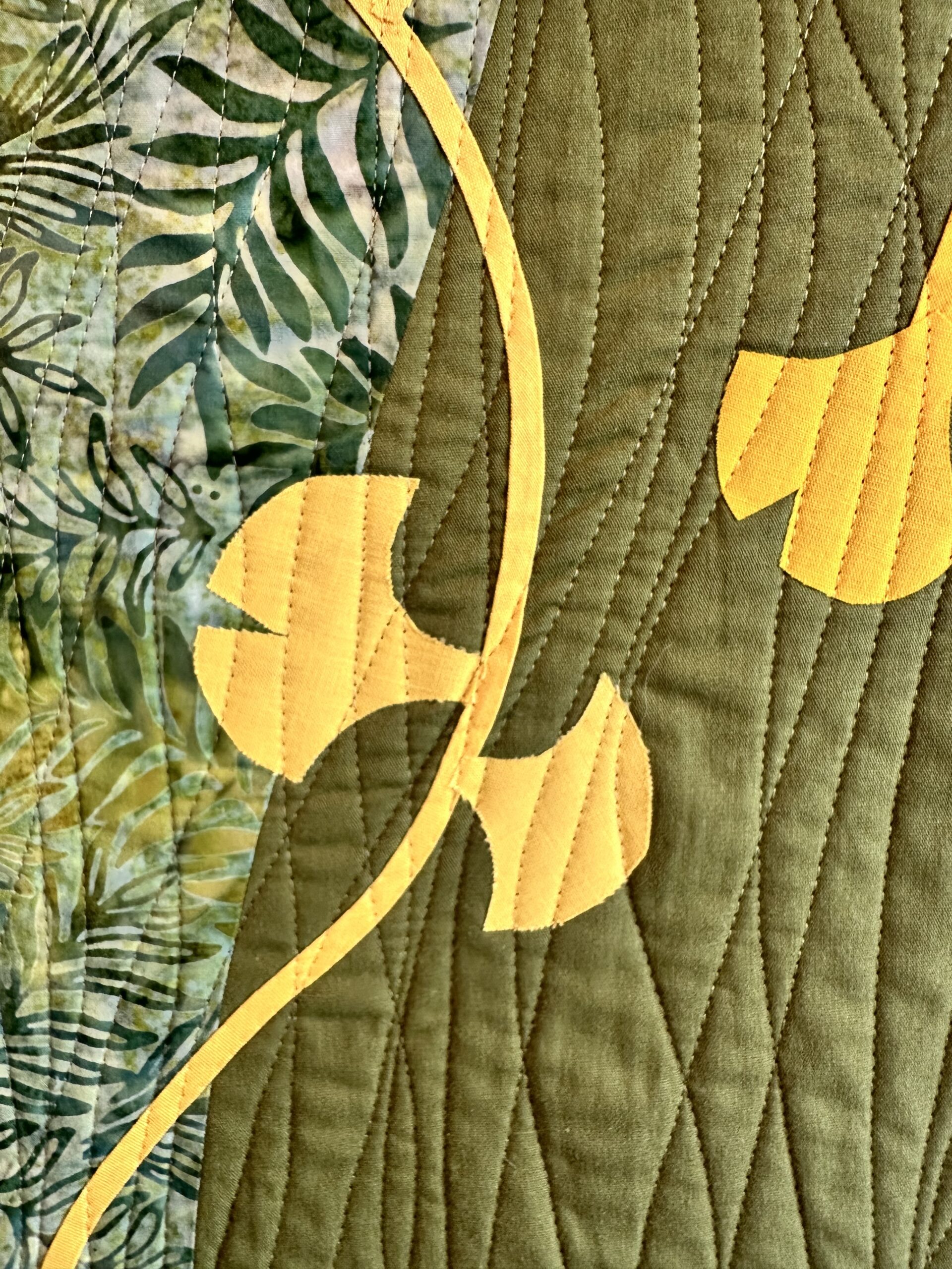COTTON FABRICS, COTTON BATTING, THREADS, HAND APPLIQUÉ, WALKING FOOT QUILTING.