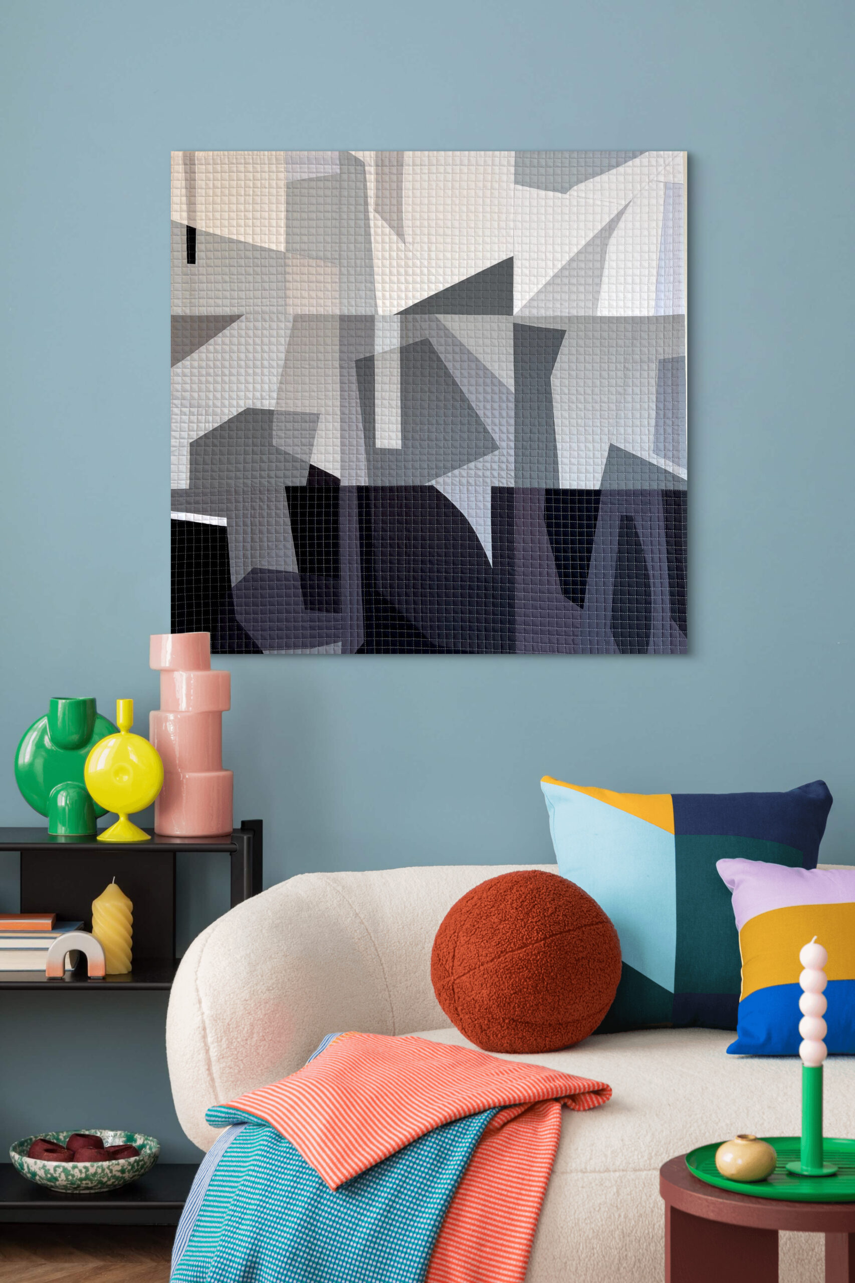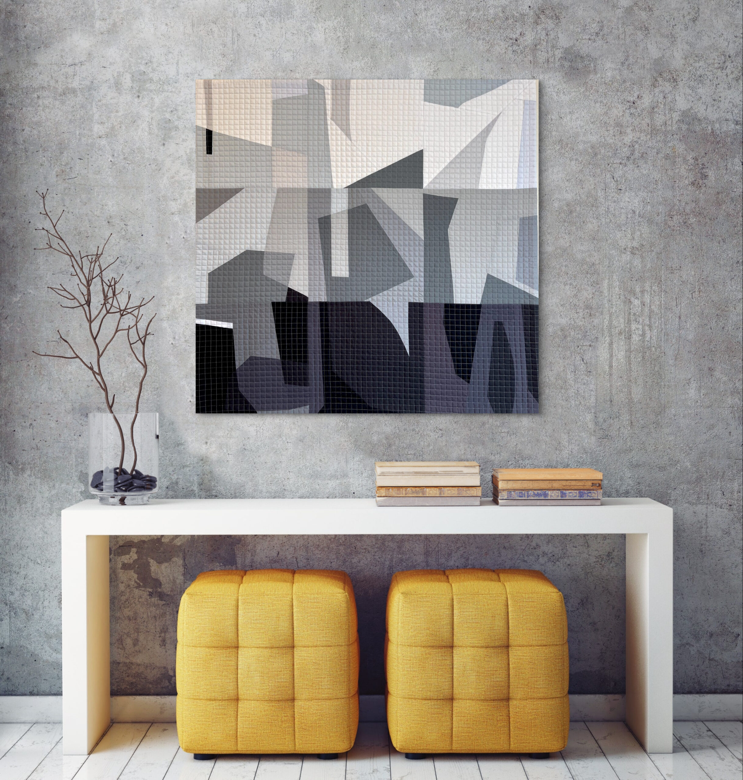 ”The similarity that exists between colors and music always amazes me. Mayors and minors keys, creating different moods. Each value needs to be orchestrated just like in music to achieve a harmony that is pleasing to the eye. To make this quilt I used more than 12 greys, and each block is an exercise about transparencies and value keys.”