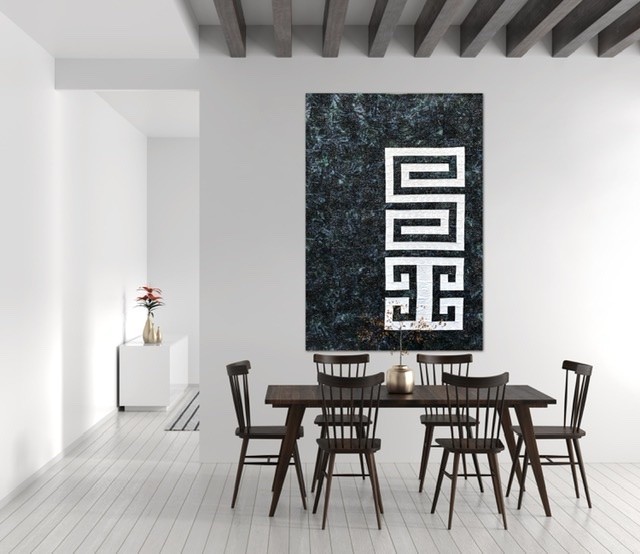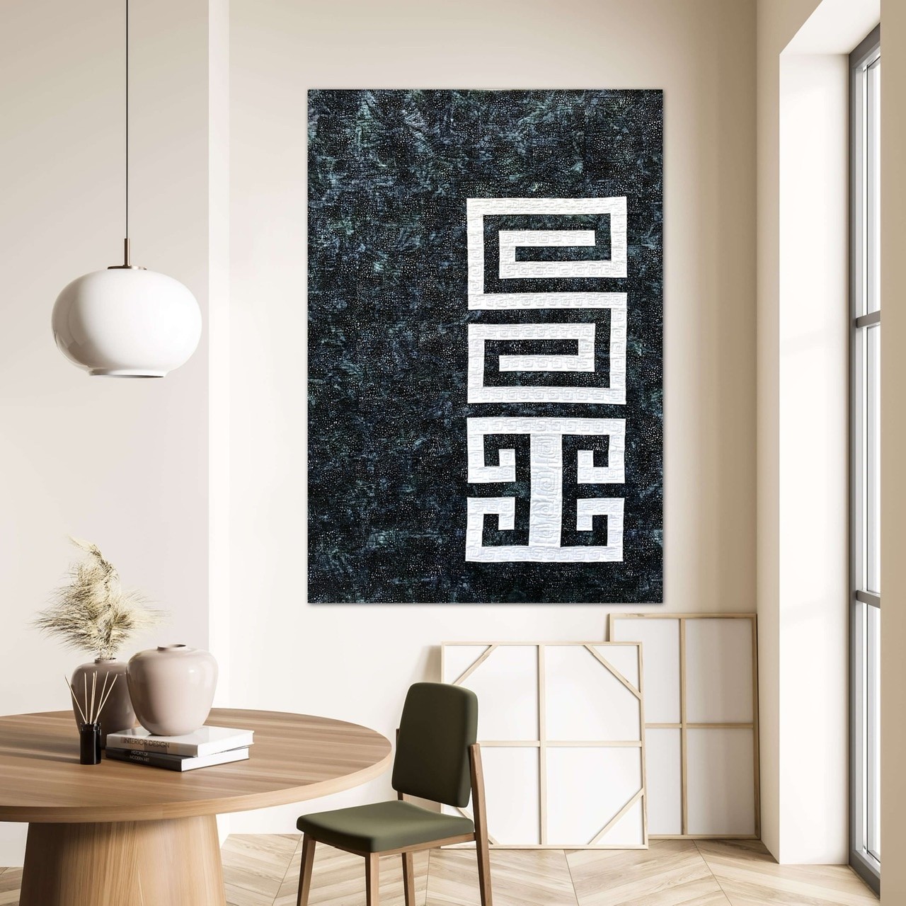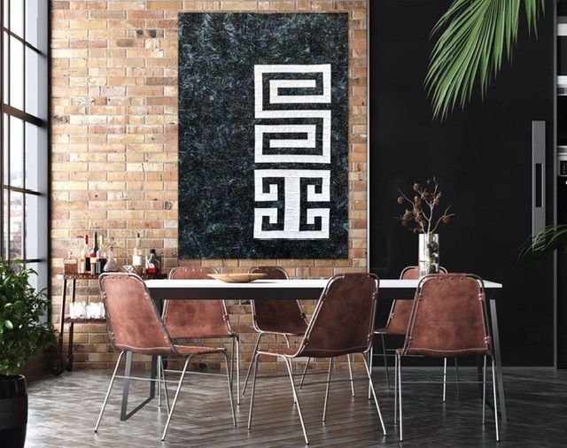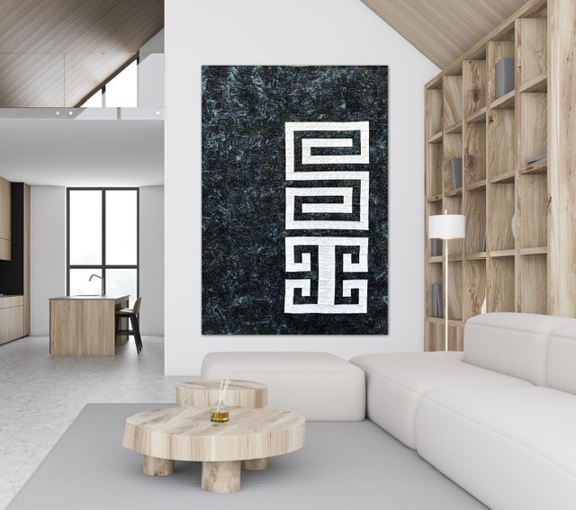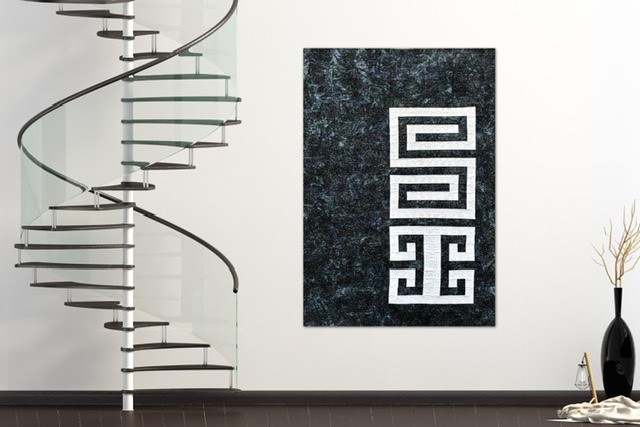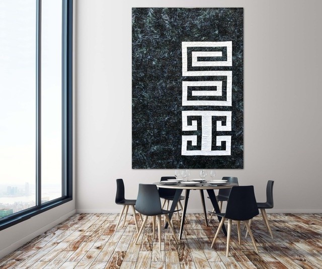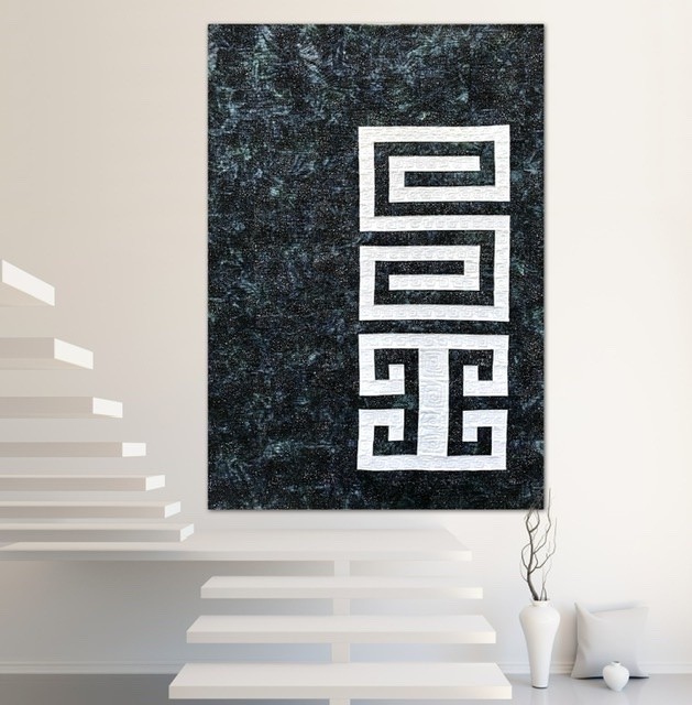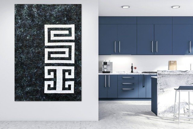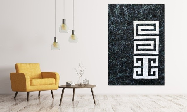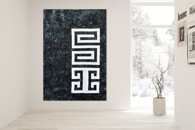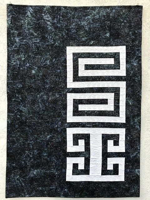 The name of this Quilt is written in “Mapudungun”, the Mapuche Language, and the inspiration of the Quilt come from the Mapuche Race and its textile Art. The Figure in the Quilt is called “Willodmawe Ñimin” and represents a hug.With this symbol in my mind, I design the quilt with all the measures an piecing. In this quilt I worked with 2 concepts, minimalism and Negative space. For the quilting process I used the walking foot and Free Motion Quilting. I Quilt the same symbol in another scale and also I quilt many words in Mapudungun that take me to that hug under a starry night, like “Pellu” (soul), “Poyen” (to love), “Üdwe” (Inner peace), “Cuyen” (moon), “Elun” (to give), “Suyai” (hope), “Ayulemen” (in love), “Pun” (night).