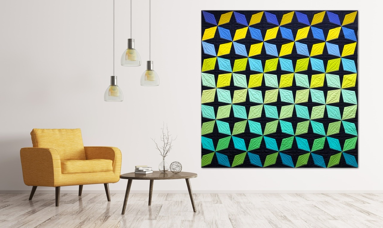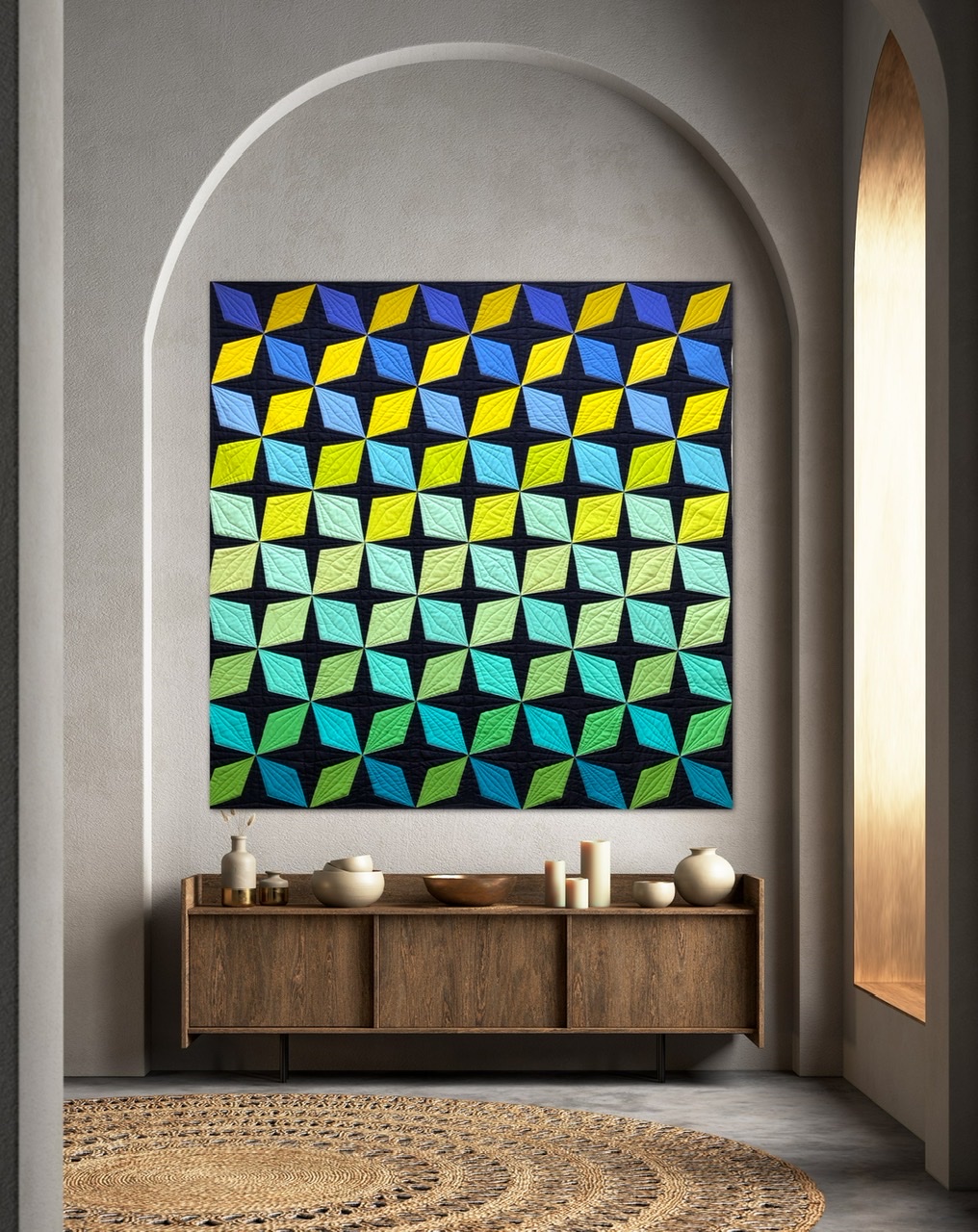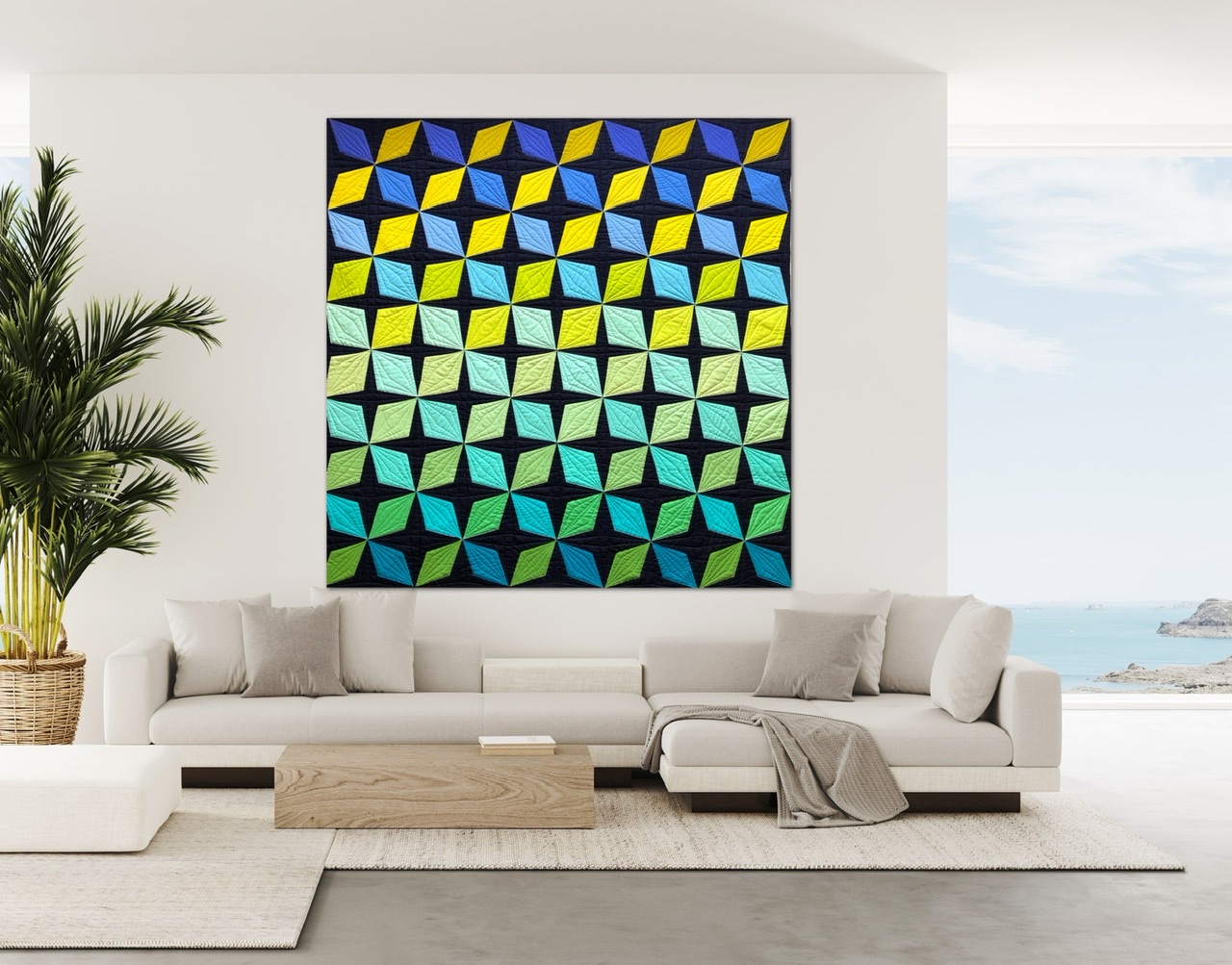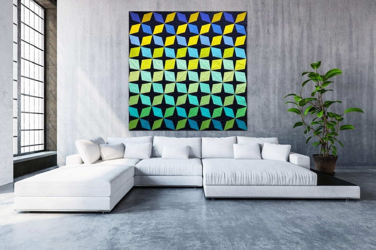 I have always admired Victor Vasarely’s artwork, his use of color gradients, optical effects and geometrical shapes. This quilt is a modest homage to his work.