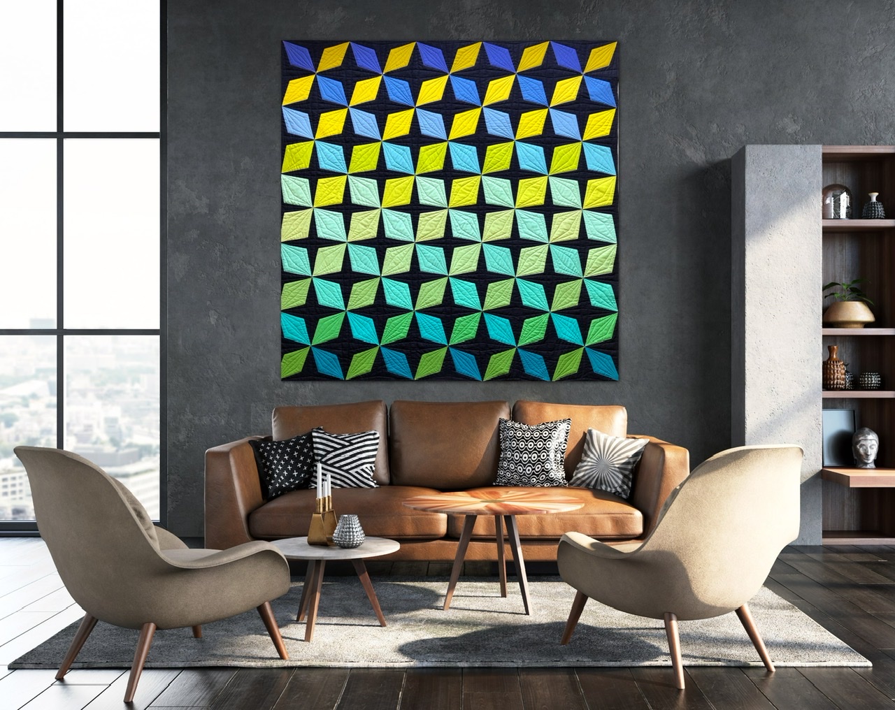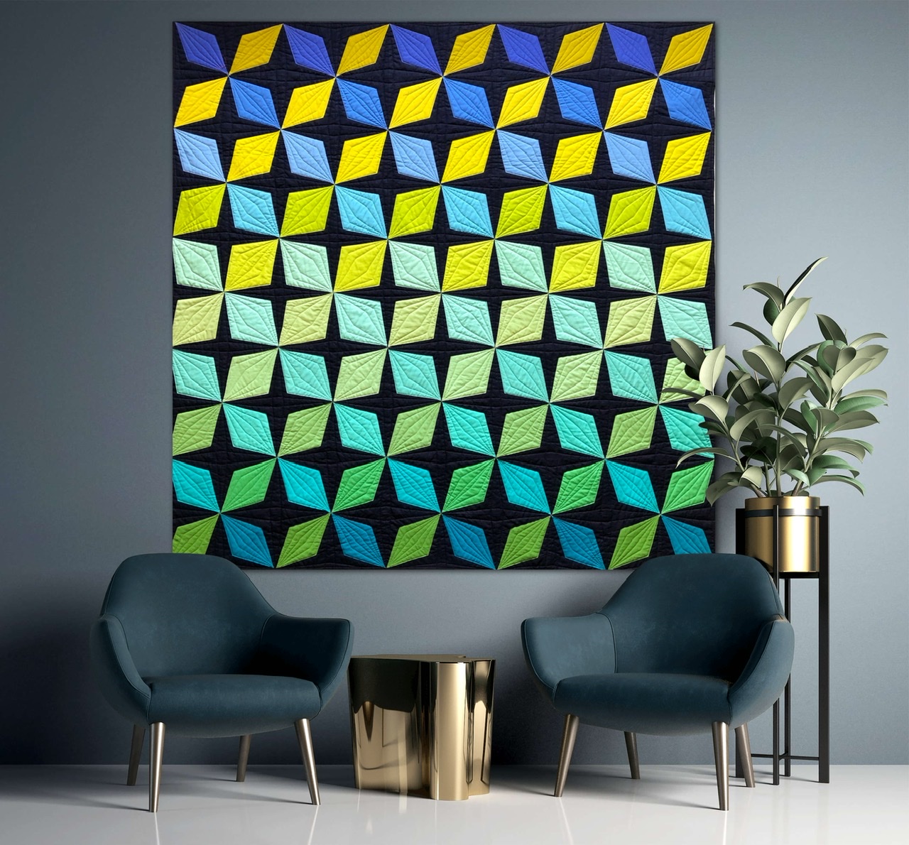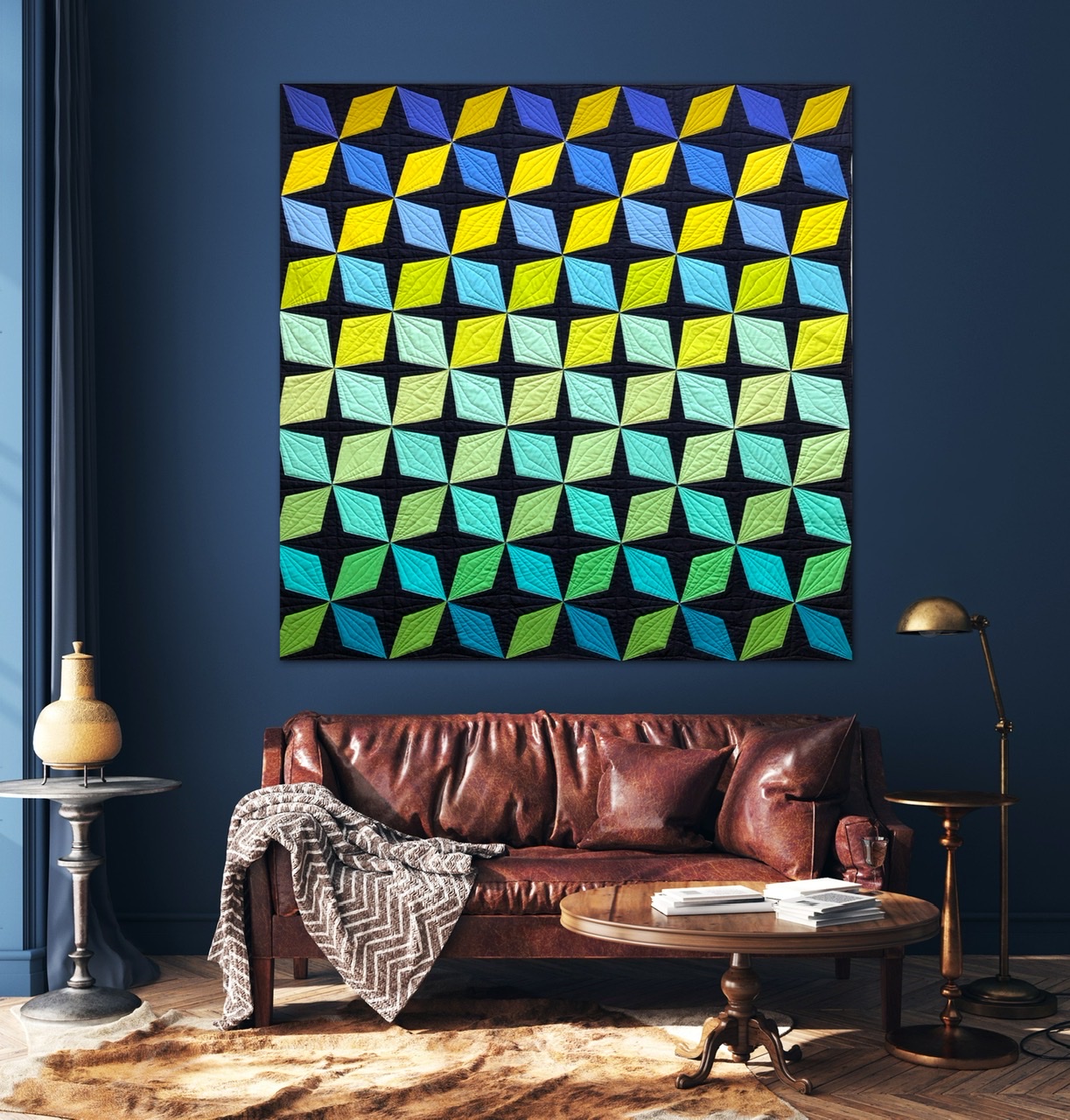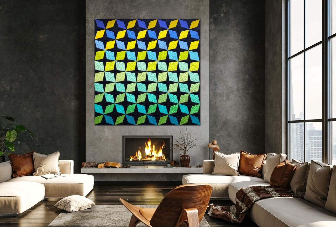 I have always admired Victor Vasarely’s artwork, his use of color gradients, optical effects and geometrical shapes. This quilt is a modest homage to his work.