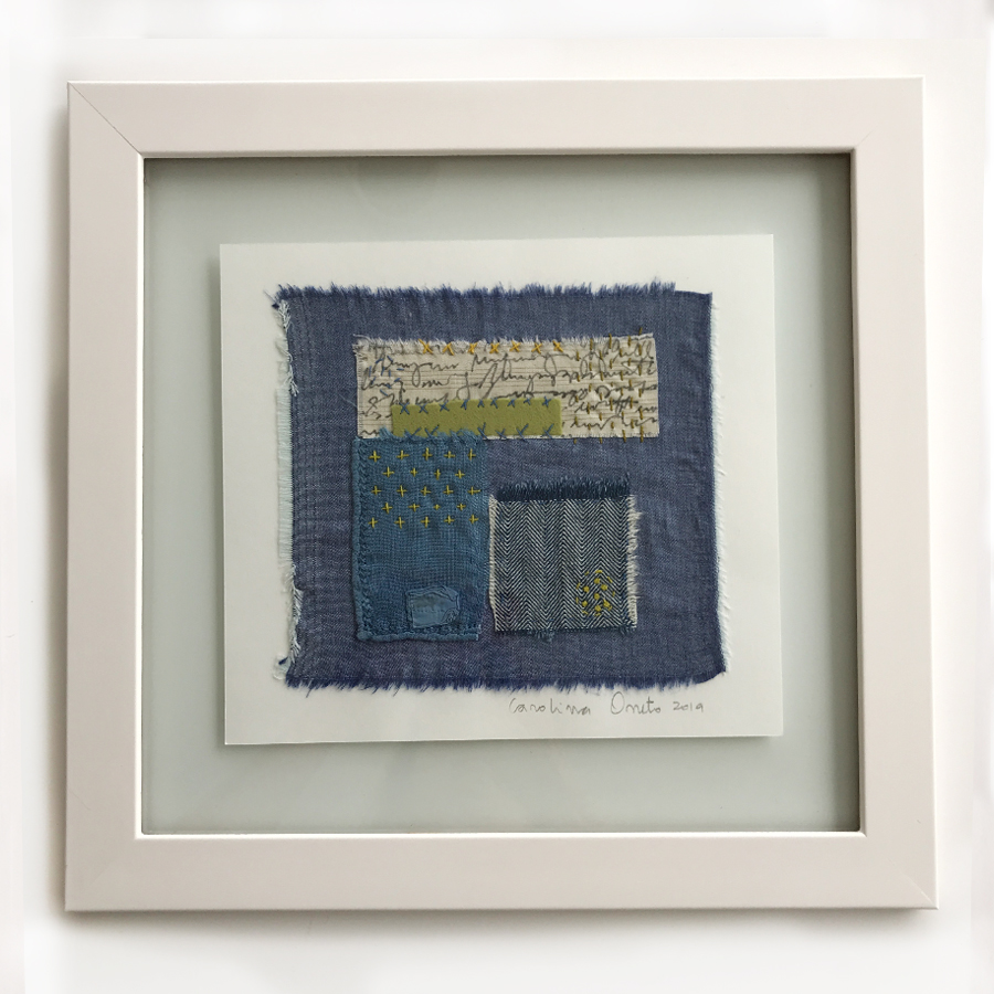 “Slow Stitching I”, 36 cm x 34 cm, enmarcado. Uso de telas recicladas, ropa reciclada, Kimonos reciclados, Hilo perlé. Bordado a mano para componer con un sentido de unidad y equilibrio.