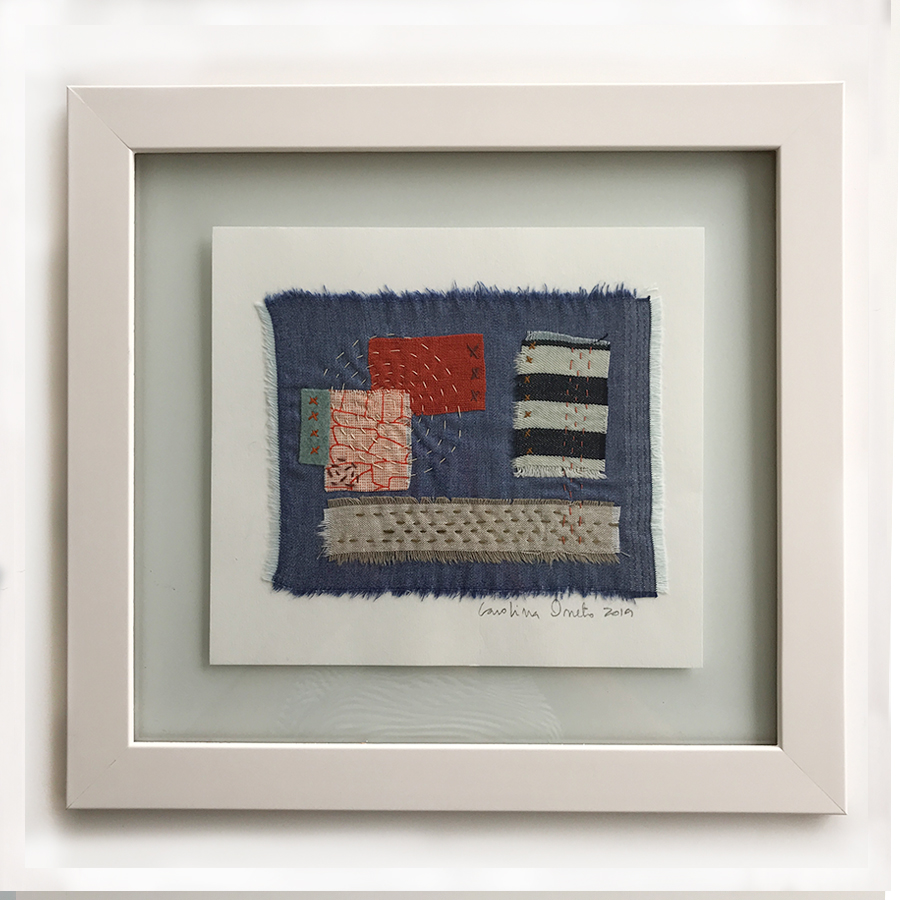 “Slow Stitching II”, 36 cm x 34 cm, enmarcado. Uso de telas recicladas, ropa reciclada, Kimonos reciclados, Hilo perlé. Bordado a mano para componer con un sentido de unidad y equilibrio.